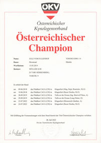 nach der erfolgreichen Ausstellung am 23. und 24.07.2022 in Klagenfurt kam heute die Champion-Urkunde aus Österreich. Jule ist jetzt offiziell "Österreichischer Champion". Das macht uns sehr stolz. Jule hatte bei Ausstellungen immer viel Spaß sich zu präsentieren, sonst hätten wir sie nicht ausgestellt.