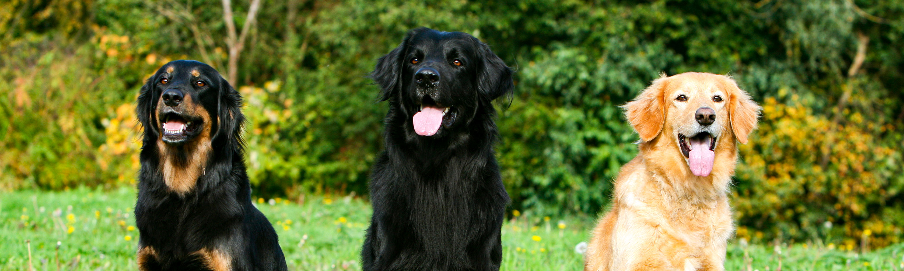 „Erwachsene“ Hovawarte in den drei Farbschlägen gemäß ihrem Rassestandard: Übrigens werden Hovawarte nie erwachsen.