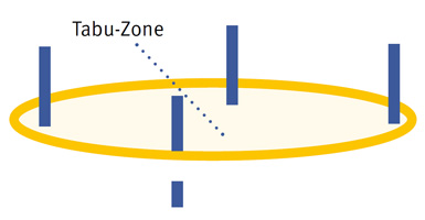 Beim Aufbau des Kreises wird in die Mitte eine Steckstange platziert. An dieser befestigt ihr ein abgemessenes Band mit dem gewünschten Radius. Auf der Kreisbahn werden in regelmäßigen Abständen die Zeltheringe, Pylone etc. platziert und das Absperrband angebracht.