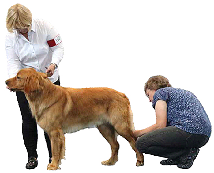 Da der Hovawart – glücklicherweise – zu den behaarten Hunderassen zählt, ist sein Körperbau mit bloßem Auge nur bedingt zu erfassen. Tiefe und Breite des Brustkorbs, Lage und Winkelung der Schulter, Sitz des Ellbogens und die Rückenlinie muss der Richter ertasten. Ob kein Rutenfehler vorliegt oder ob beim Rüden die Hoden vorhanden sind, kann ebenfalls nur palpatorisch erfasst werden. Ergo: unser Ausstellungshund muss sich ganz unbefangen von Fremden anfassen lassen. Dazu steht er, aufmerksam und entspannt. Je gelassener er dies tut, um so sympathischer wird er rüberkommen. Wenn er dann noch einen sportlichen Muskeltonus offenbart, wird dies unweigerlich Pluspunkte bringen.